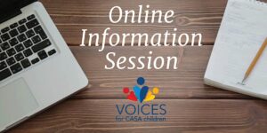 Every month Voices For CASA Children hosts Information Sessions both virtually and in person. Attending one of the 40-minute sessions is a great way to learn more about the duties of a CASA volunteer. A VOICES staff member, who is also a CASA volunteer, will outline responsibilities, the application process, one-time and on-going training requirements and the general time commitments.